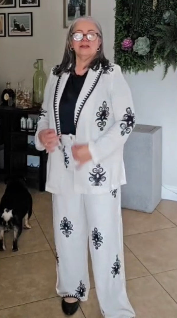 Conjunto de blazer y pantalón bordado que combina elegancia y comodidad. Perfecto para cualquier ocasión, este conjunto aportará un toque sofisticado a tu guardarropa. La artesanía y detalle en el bordado aseguran calidad y estilo duraderos.