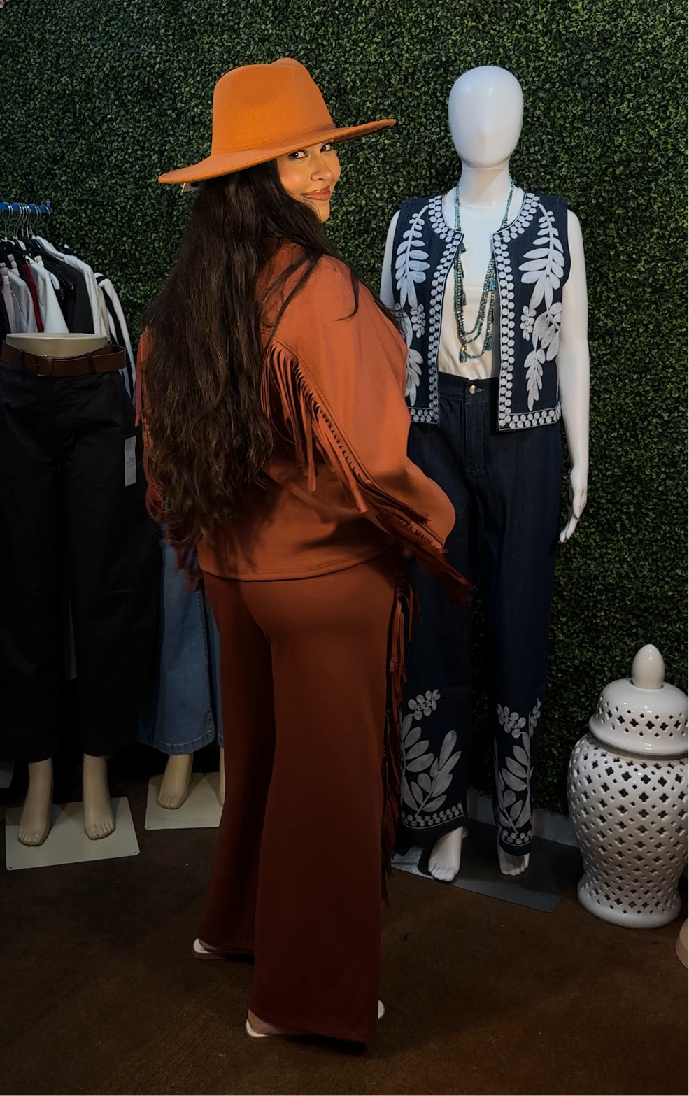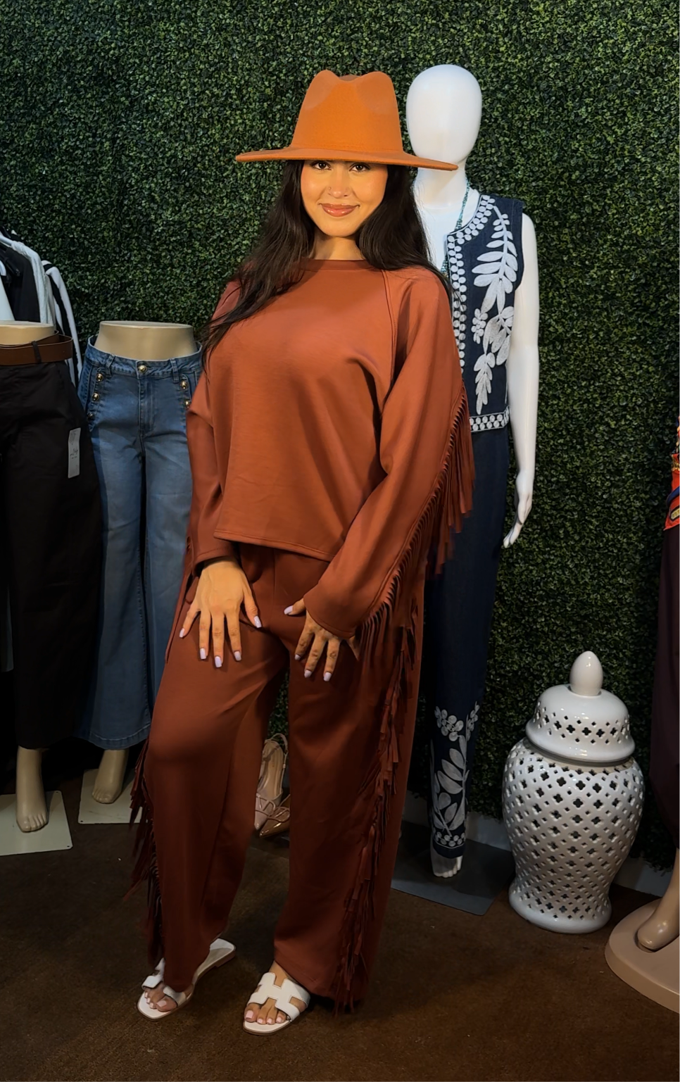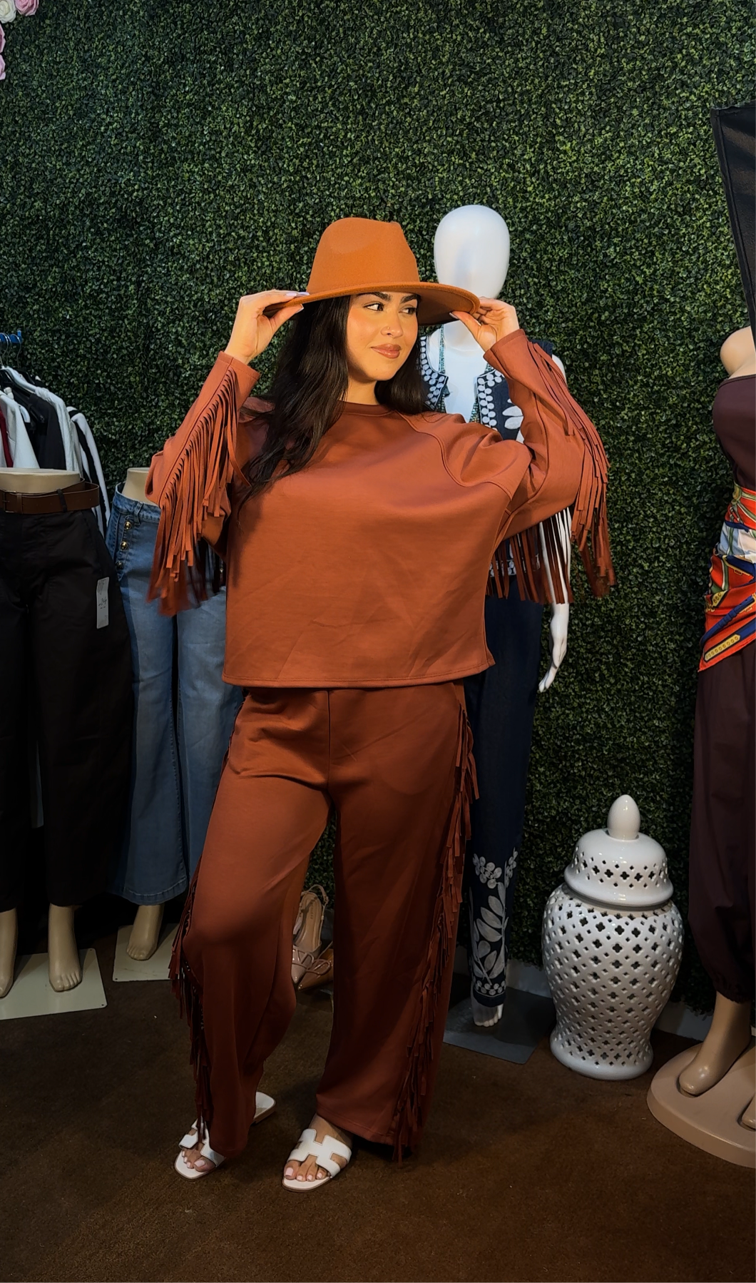 El Set Barby y Mabe incluye una enguatada y un pantalón con flecos de temporada. Este conjunto te mantendrá abrigada y a la moda, con su diseño único y materiales de alta calidad. Confort y estilo en una sola opción.