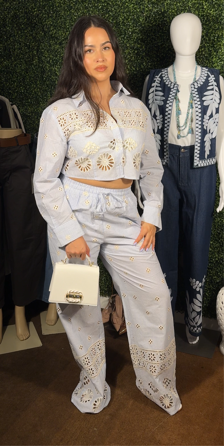 Disfruta de la elegancia y estilo de Set Bella, con su blusa y pantalón bordado. Haz una declaración de moda con este conjunto sofisticado y atemporal. Hecho con los mejores materiales y detallado con hermosos bordados, este set te hará lucir y sentirte increíble en cualquier ocasión.